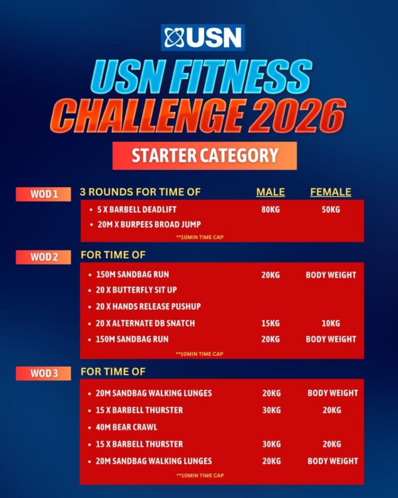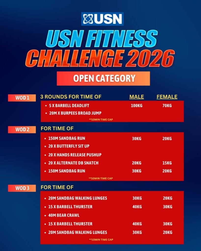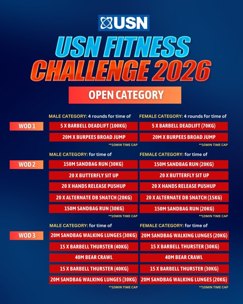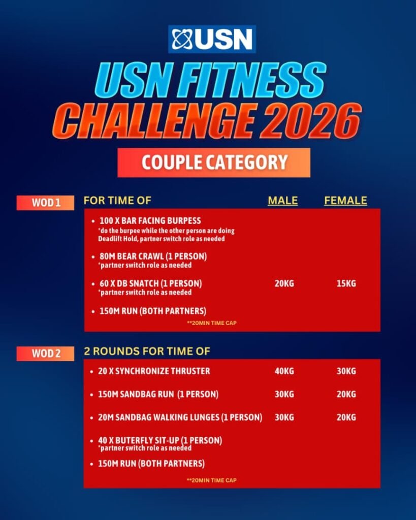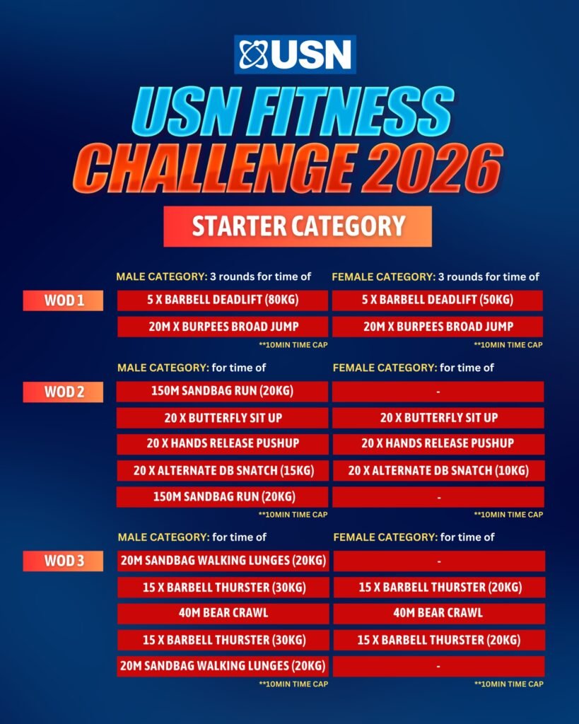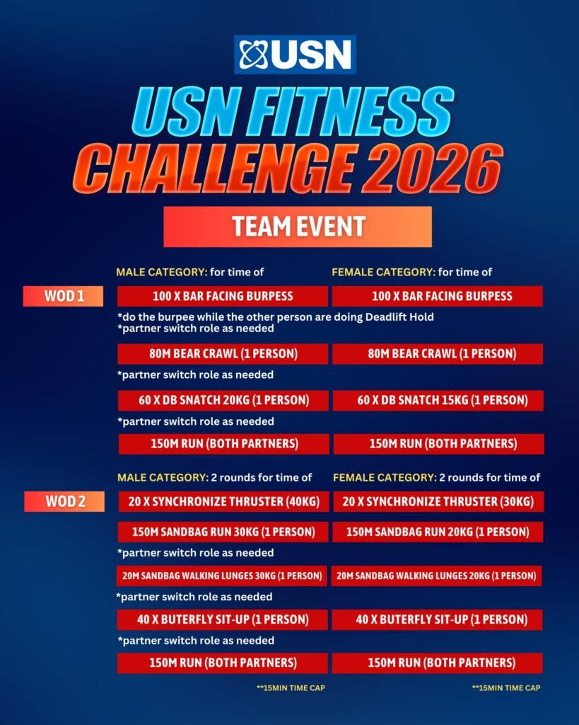 USN Fitness Challenge 2026 is back on 7–8 February 2026 at Gelanggang Mokhtar Dahari, Presint 18, Putrajaya, bringing a full‑body test of endurance, stamina and strength. This year’s edition features five categories – Men Open, Women Open, Men Starter, Women Starter and Couple – giving both seasoned athletes and newer competitors a chance to push their limits on an exciting functional fitness course.