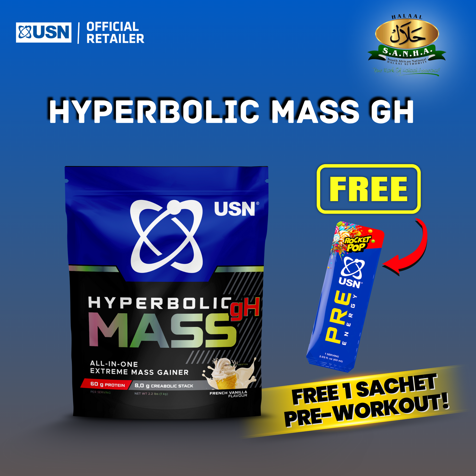 USN Hyperbolic Mass 2kg is an all-in-one mass gainer designed for individuals with fast metabolisms. It provides a high-quality carbohydrate and protein matrix, rich in BCAAs, creatine, and glutamine. Each serving delivers approximately 1,190 kcal, 63g of protein, and 8.6g of creatine. The formula also includes a blend of vitamins and amino acids to enhance performance and recovery. It comes in various flavors, including Chocolate, Strawberry, and Vanilla.
