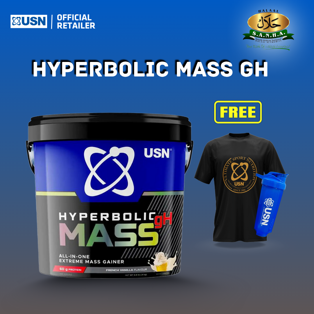 The USN Hyperbolic Mass 4kg is a high-calorie mass gainer designed to support muscle growth and recovery. Each serving delivers approximately 1,067 calories, 60g of protein, and 7,500mg of creatine, making it suitable for individuals with a fast metabolism or those aiming to increase body mass. The formula also includes a blend of vitamins and amino acids to enhance performance and recovery. It comes in various flavors, including Dutch Chocolate, Vanilla, and Strawberry Cheesecake.